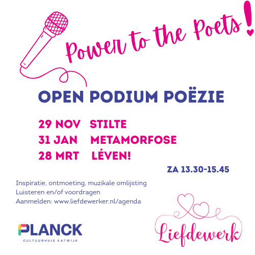3 Poëziemiddagen met 3 prachtige thema’s om elkaar te inspireren. Za 29 nov (stilte), 31 jan (metamorfose) en 28 mrt (léven!). Kom luisteren en/of kom je werk voordragen op het podium van de Verhalenzaal van Cultuurhuis Planck in Katwijk!